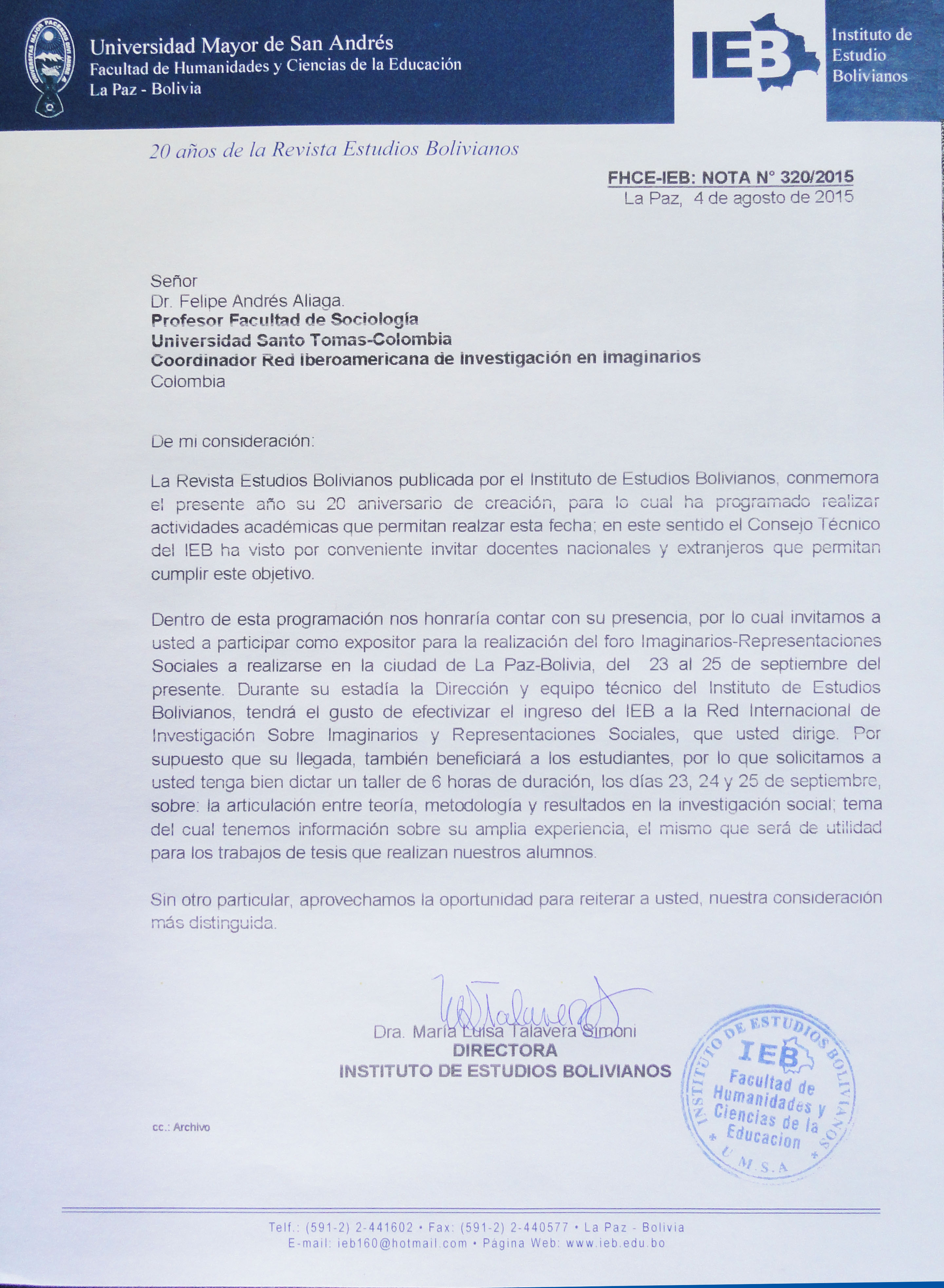 El Dr. Felipe Aliaga Sáez, coordinador de RIIR, ha sido invitado por el Instituto de Estudios Bolivianos (IEB) de la Universidad Mayor de San Andrés en la ciudad de La Paz, con motivos de la celebración de los 20 años de la Revista Estudios Bolivianos; el Dr. Aliaga participará como expositor en el foro Imaginarios-Representaciones Sociales a realizarse del 23 al 25 de septiembre. Así también se hará efectivo el ingreso del IEB a la red.
