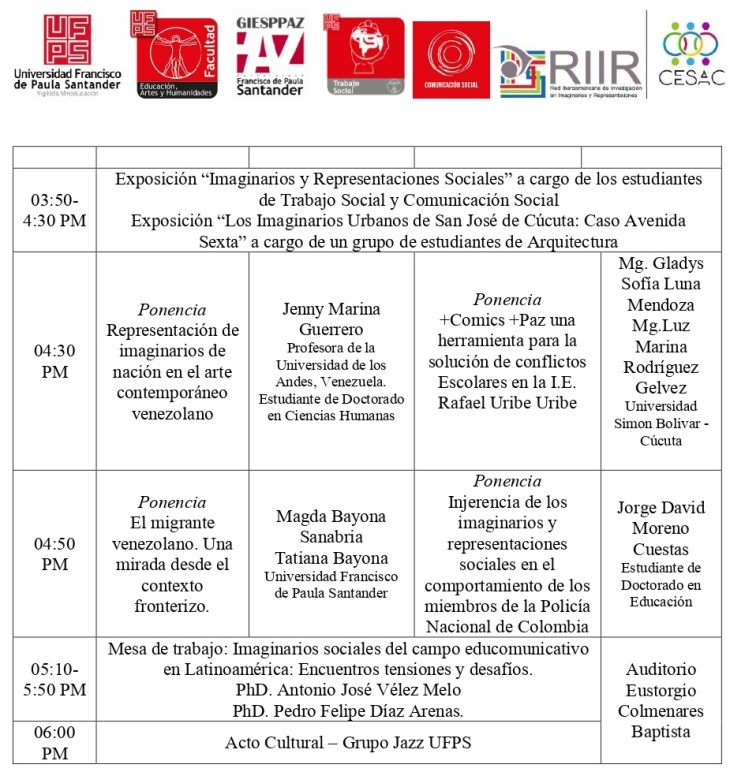 Inicio » Simposio » Agenda. I Simposio de Imaginarios y Representaciones Sociales. UFPS, Cúcuta, 11 y 12 de junio de 2019.