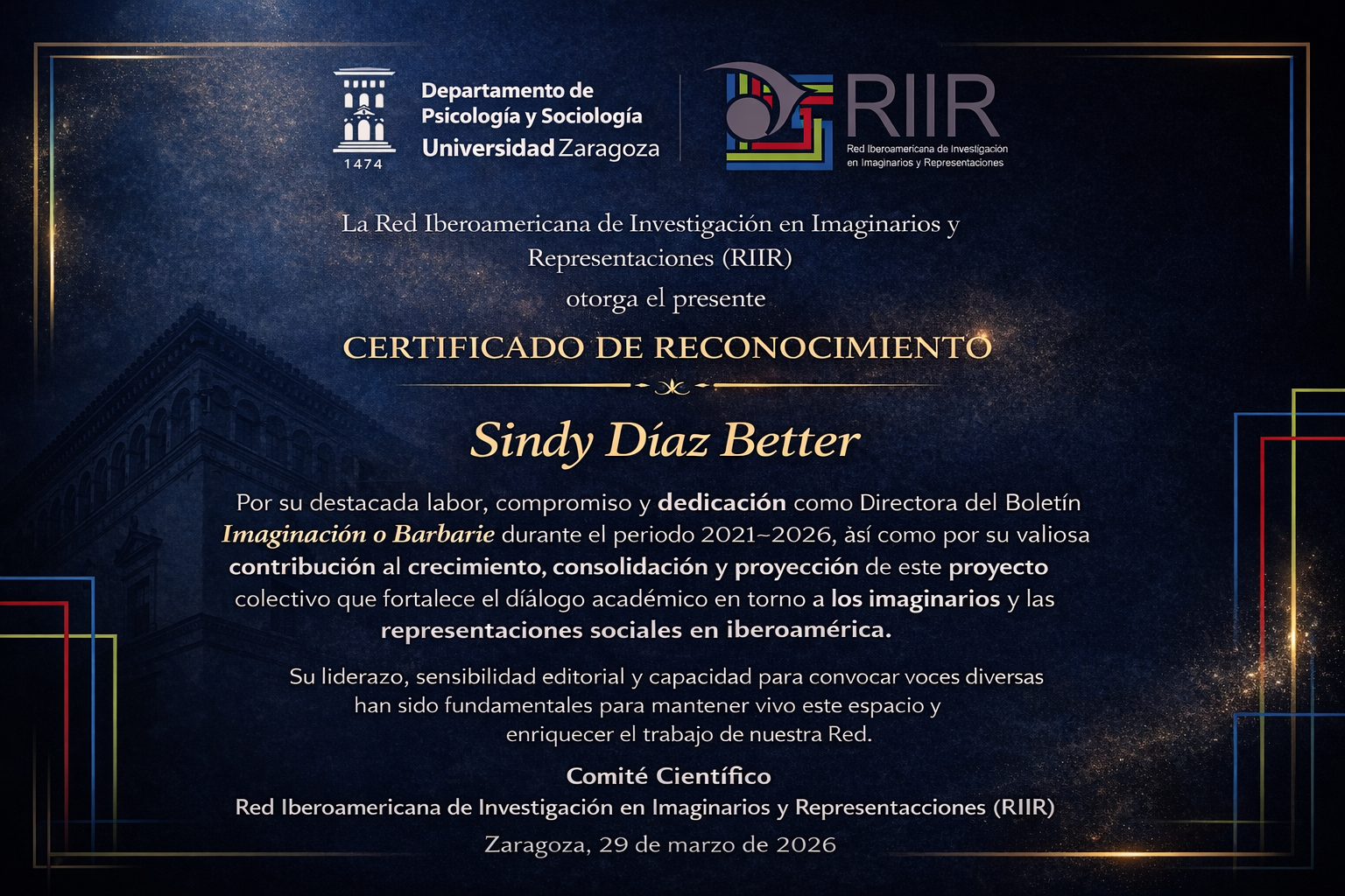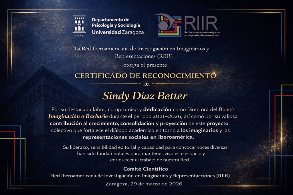 Desde la Red Iberoamericana de Investigación en Imaginarios y Representaciones (RIIR), expresamos nuestro más sincero reconocimiento a Sindy Díaz Better por su destacada labor como Directora del Boletín Imaginación o Barbarie durante el periodo 2021–2026.