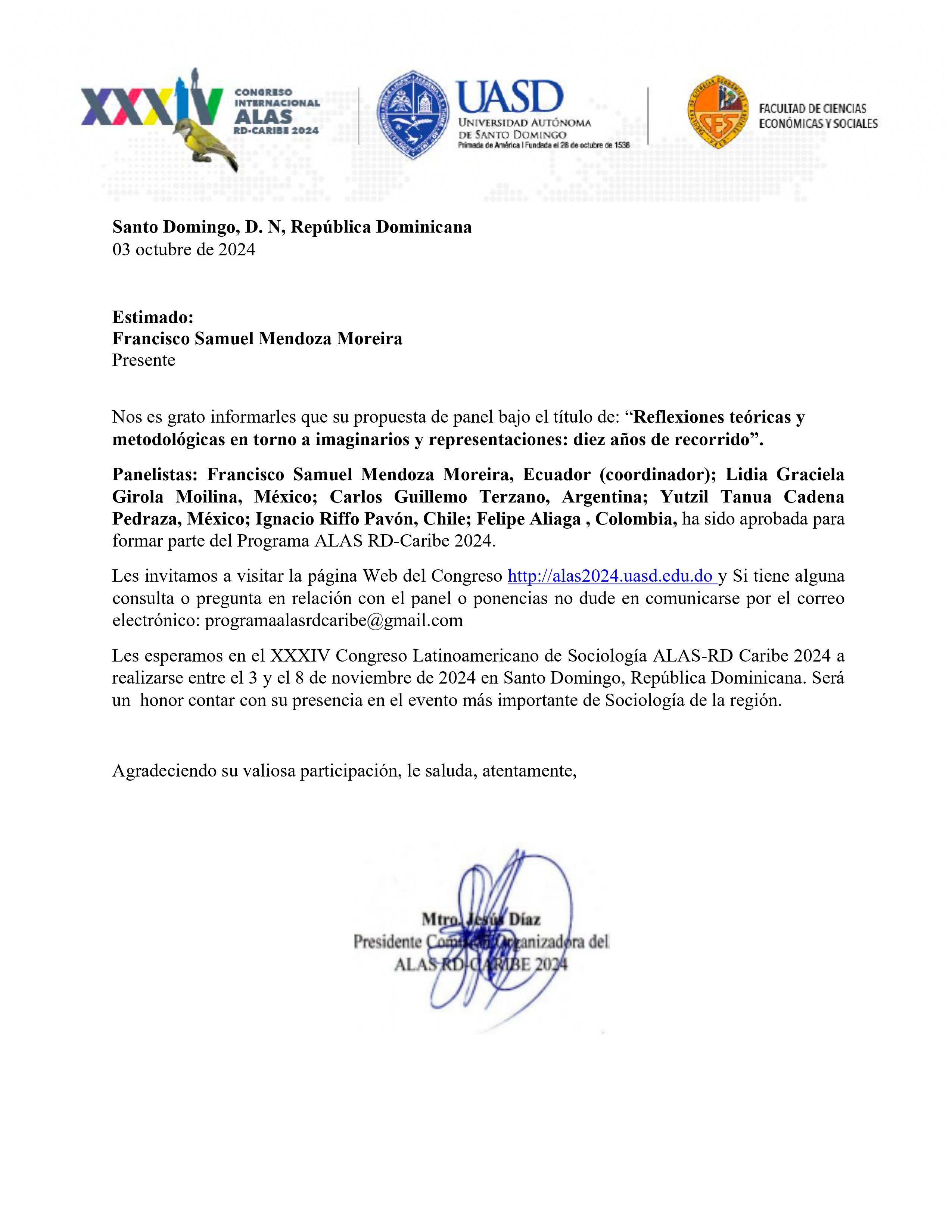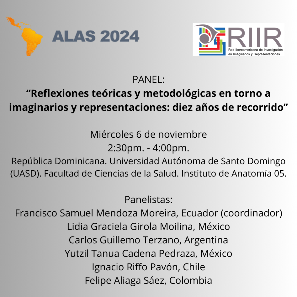 Los miembros de la RIIR, Francisco Mendoza, Lidia Girola, Carlos Terzano, Yutzil Cadena, Ignacio Riffo y Felipe Aliaga, invitan a participar en el panel: «Reflexiones teóricas y metodológicas en torno a imaginarios y representaciones: diez años de recorrido» el cual se presentará en el XXXIV Congreso ALAS República Dominicana.