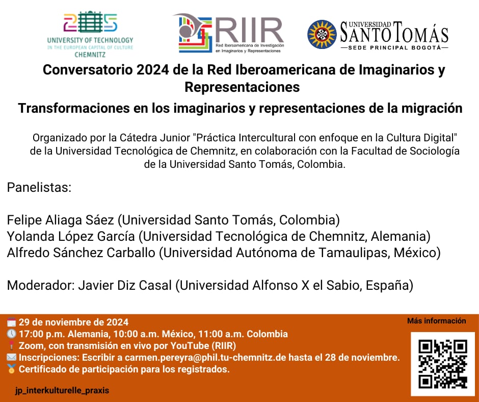 Este evento de la Red Iberoamericana de Imaginarios y Representaciones (RIIR), es parte del plan de acción del Grupo de Trabajo de Migraciones, fue organizado por la Cátedra Junior “Práctica Intercultural con enfoque en la Cultura Digital” de la Universidad Tecnológica de Chemnitz, en colaboración con la Facultad de Sociología de la Universidad Santo Tomás, Colombia.