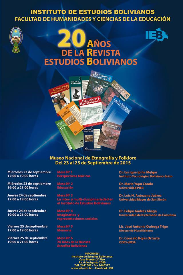 El Instituto de Estudios Bolivianos de la Universidad Mayor de San Andrés en La Paz-Bolivia, celebra los 20 años de la “Revista Estudios Boliviano”, enmarcada en esta actividad se realizará el 24 de septiembre la mesa sobre imaginarios y representaciones sociales, en donde expondrán el Dr. Ignacio Apaza, con la ponencia “Metáforas ontológicas y el tiempo en aymara”; Msc. Beatriz Rossel, con el trabajo “Los estudios sobre imaginarios en Bolivia” y lic. Carla Reque, con “El imaginario filosófico. Una aproximación desde la perspectiva de Cornelius Castoriadis al libro Theatrum Ginecologicum de B. Lozada y al artículo imaginario y nación en la crítica literaria de la novela Juan De La Rosa de Nataniel Aguirre de Martín Mercado”. Los comentarios estarán a cargo del invitado internacional Dr. Felipe Aliaga de la Universidad Santo Tomás-Colombia. Se realizará una presentación general del trabajo de imaginarios en el IEB a cargo de la Dra. Maria Lily Maric.