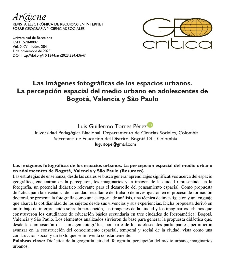 El estudio de Luis Guillermo Torres Pérez aborda estas preguntas con una propuesta didáctica innovadora que combina fotografía, percepción espacial, imaginarios urbanos y educación geográfica. Su investigación, realizada con estudiantes de educación básica secundaria en Bogotá, Valencia y São Paulo, muestra que la fotografía no es solo una imagen: es un lenguaje, un acto de lectura y escritura del espacio, y una herramienta poderosa para comprender cómo se construyen los sentidos urbanos entre los más jóvenes.
